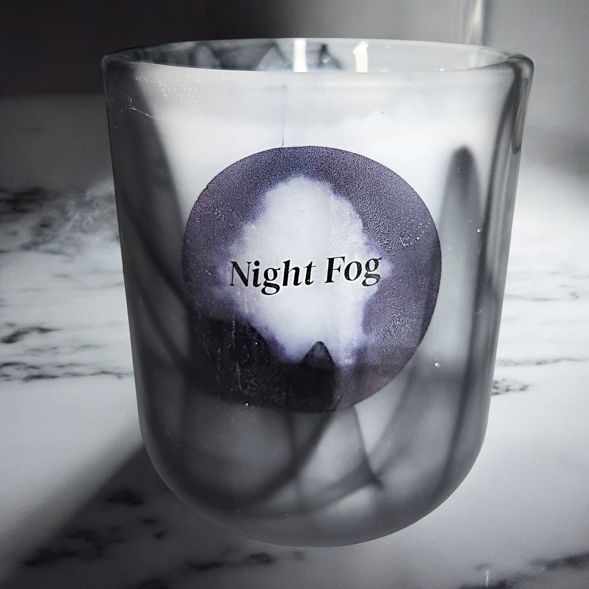Celebrate Halloween or any Fall or winter night with the Night Fog candle. A heavy glass tumbler designed with black and white swirls mimics a foggy night. The 10 oz. pale grey candle is hand poured from a vegan blend of soy, coconut and sand waxes. The fragrance is a light blend of water, woods and a touch of vanilla. The double cotton wick ensures a complete melt pool. The candle comes in a black box with a window.