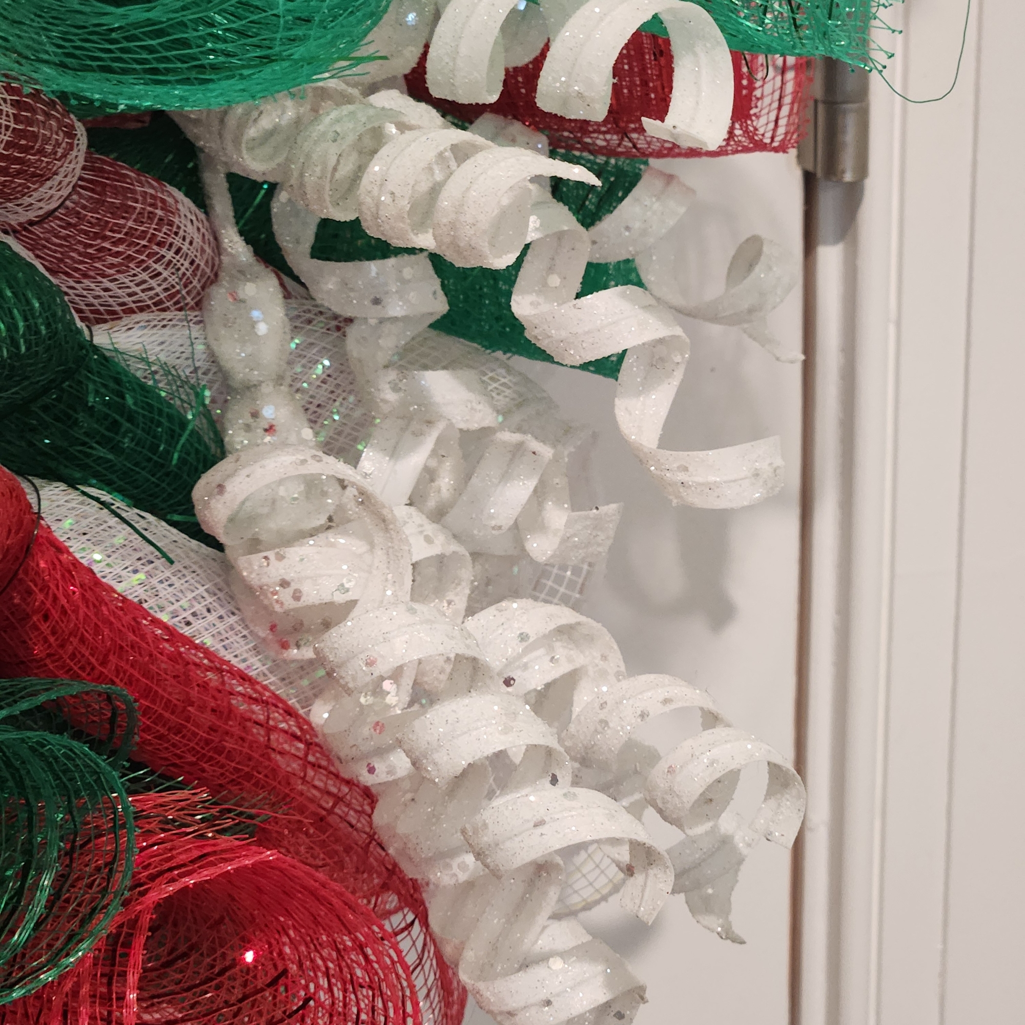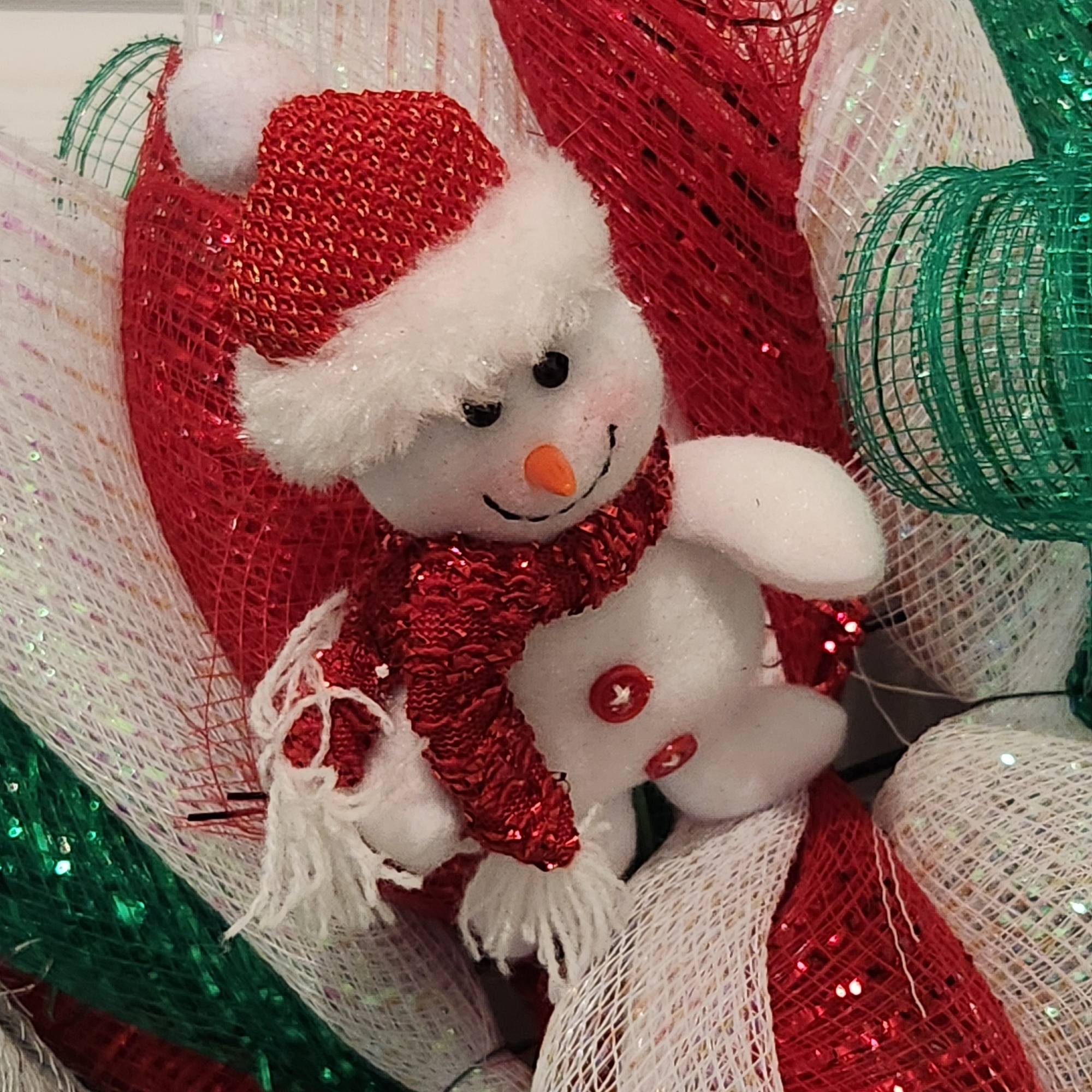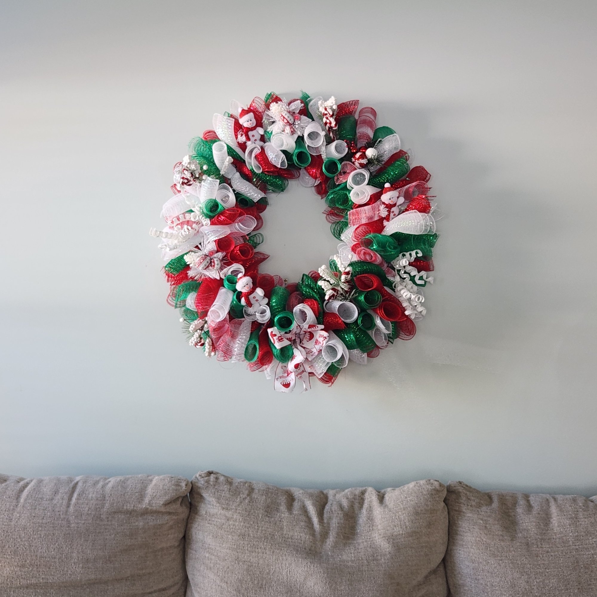 Decorate your door with cheery, bright Christmas wreath in traditional colors of red, white and green. The deco mesh curls are accented with snowmen, ornaments, curly spirals, candy canes and berries. It's finished with a red and white snowman ribbon. The wreath is an extra large 24 inches making it an ideal fit on an empty wall space.